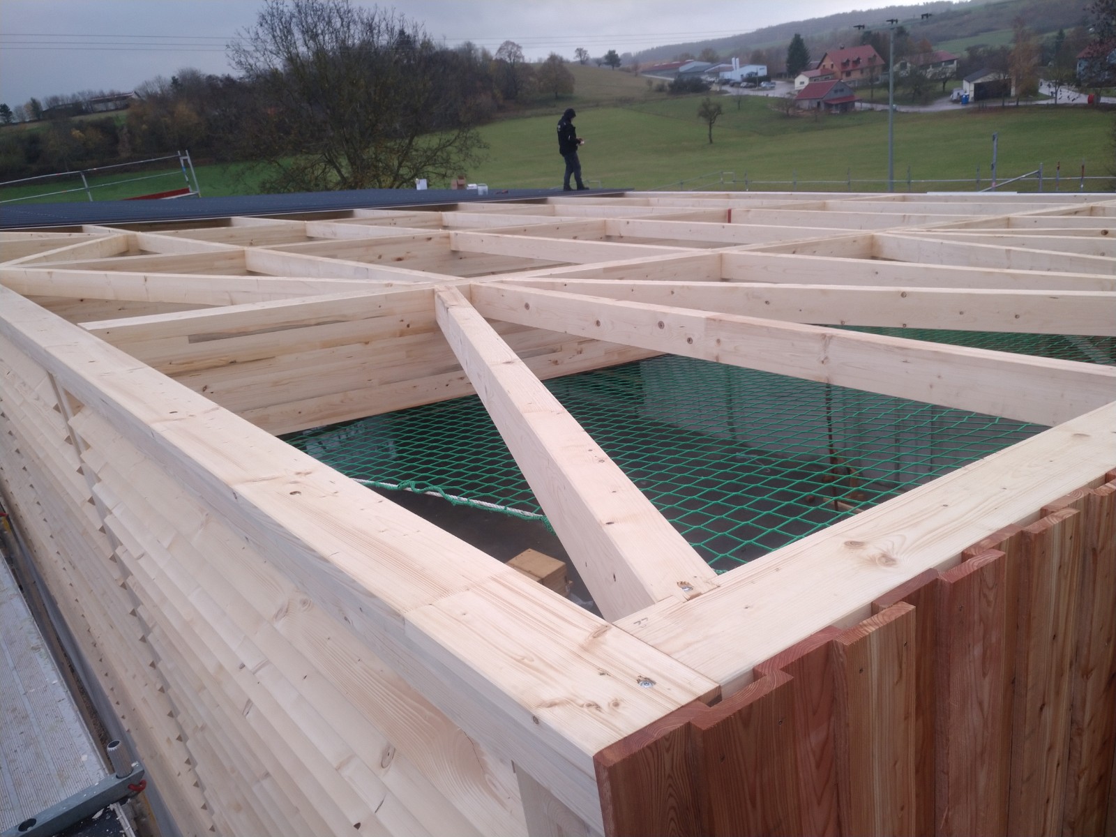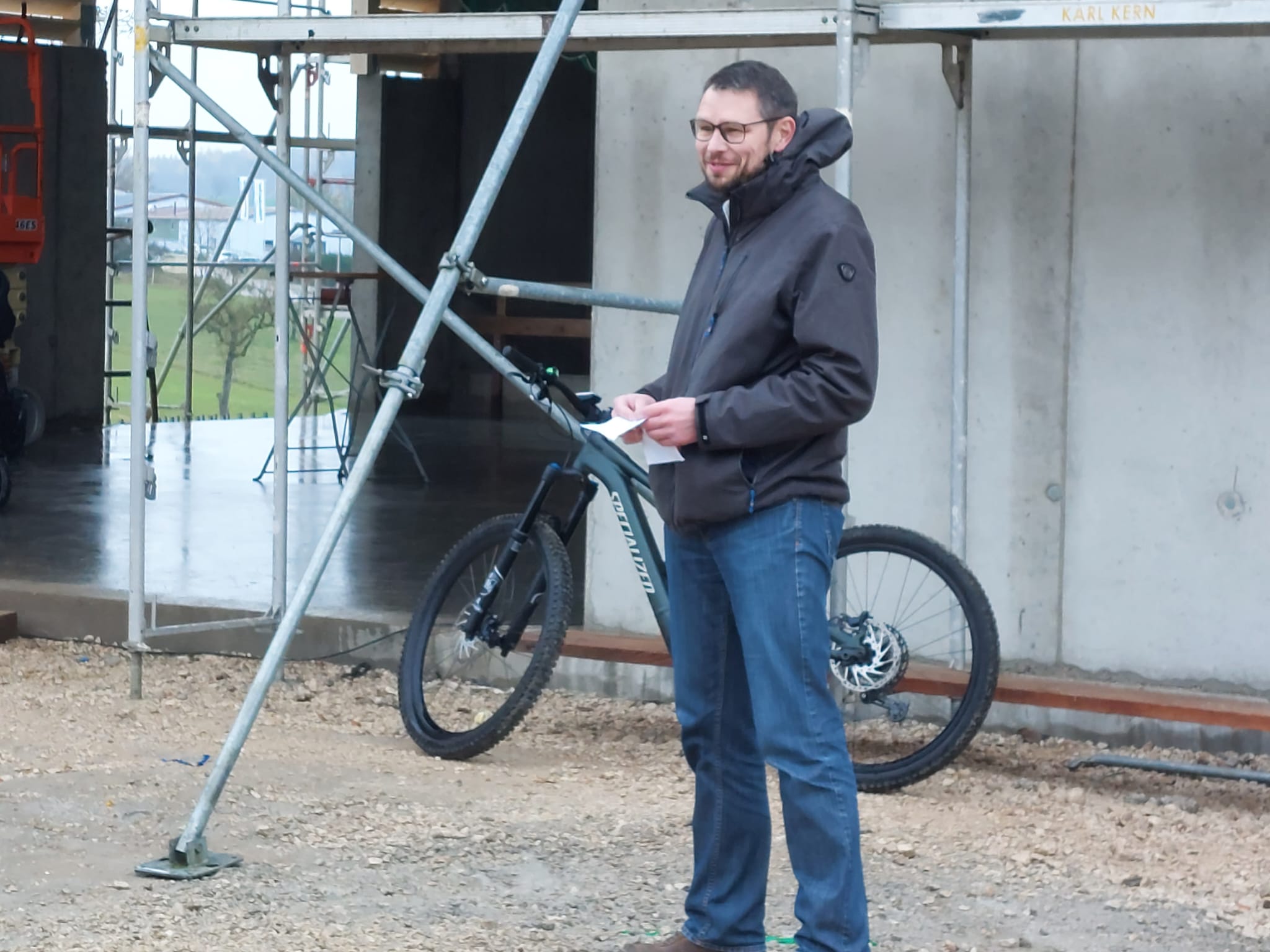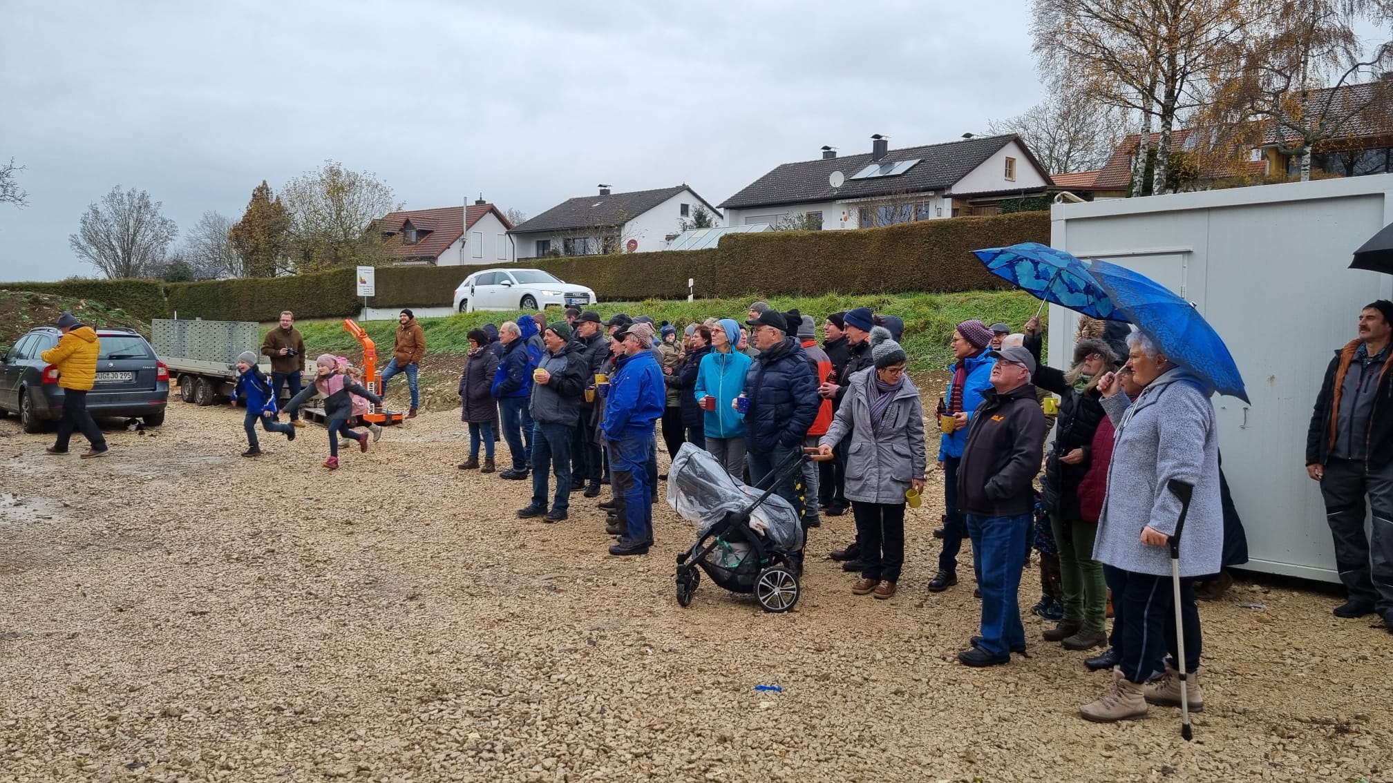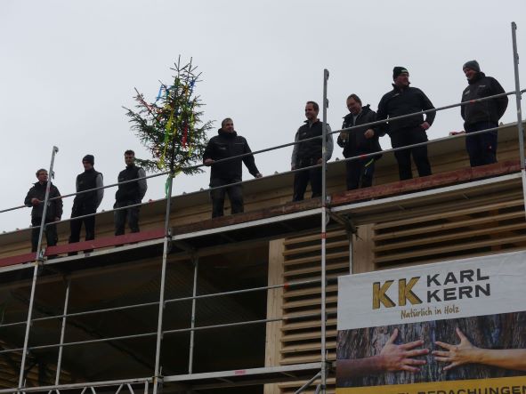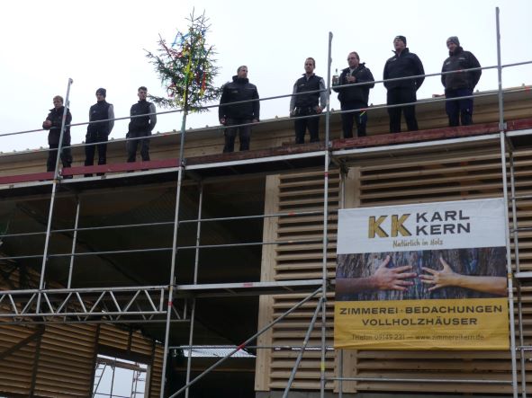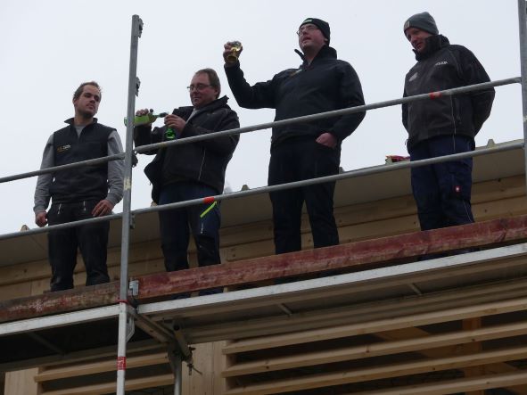 Am Freitag stand einer der größten Meilensteine bei der Umsetzung unseres Nahwärmenetzes an. Bei für die Jahreszeit typischem nass kaltem Wetter, haben sich ca. 100 Gäste und Handwerker am Heizhaus für das Richtfest eingefunden. Vor allem die warmen Getränke wie Glühwein und Kinderpunsch waren bei allen sehr beliebt, wodurch sich die Wartezeit bis zum Höhepunkt der Veranstaltung gut überbrücken ließ. Diesen bildete der Richtspruch, der durch die Fa. Kern vorgetragen wurde. Ganz traditionell wurden dabei drei Gläser Wein geleert, von denen zwei im Anschluss vom Dach herab geworfen wurden und eines beim Zimmerermeister verblieb.