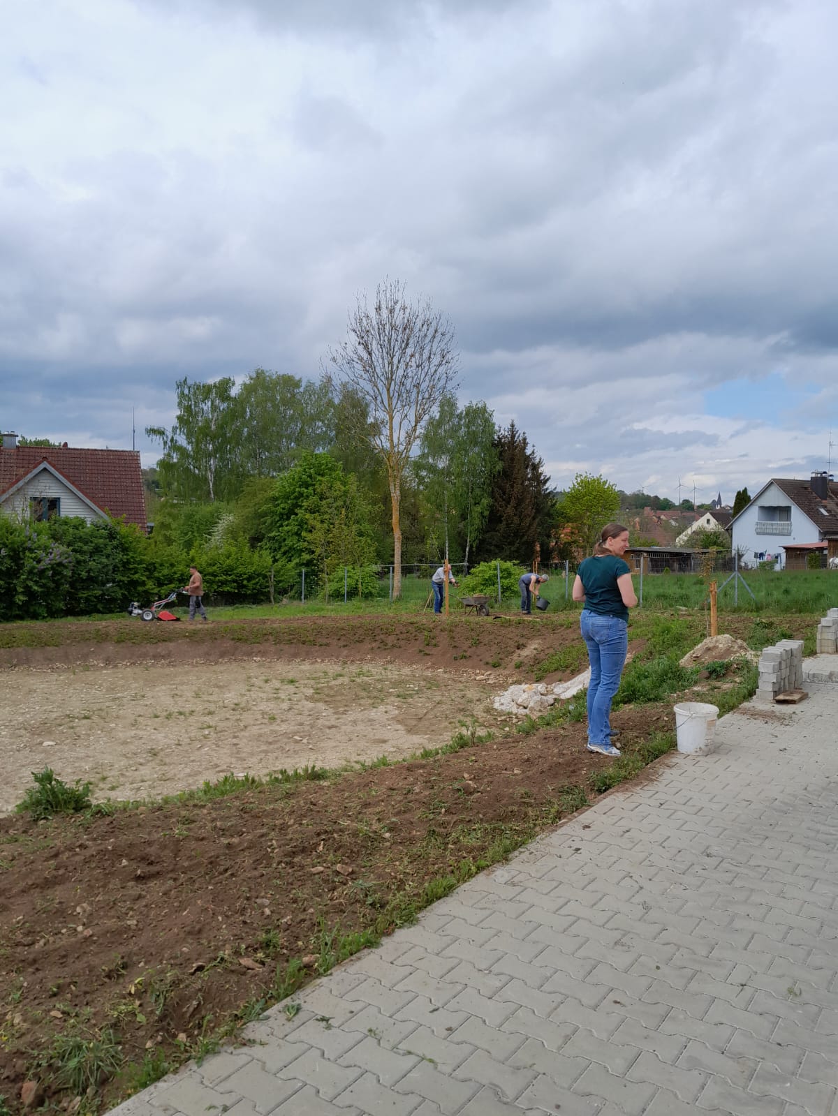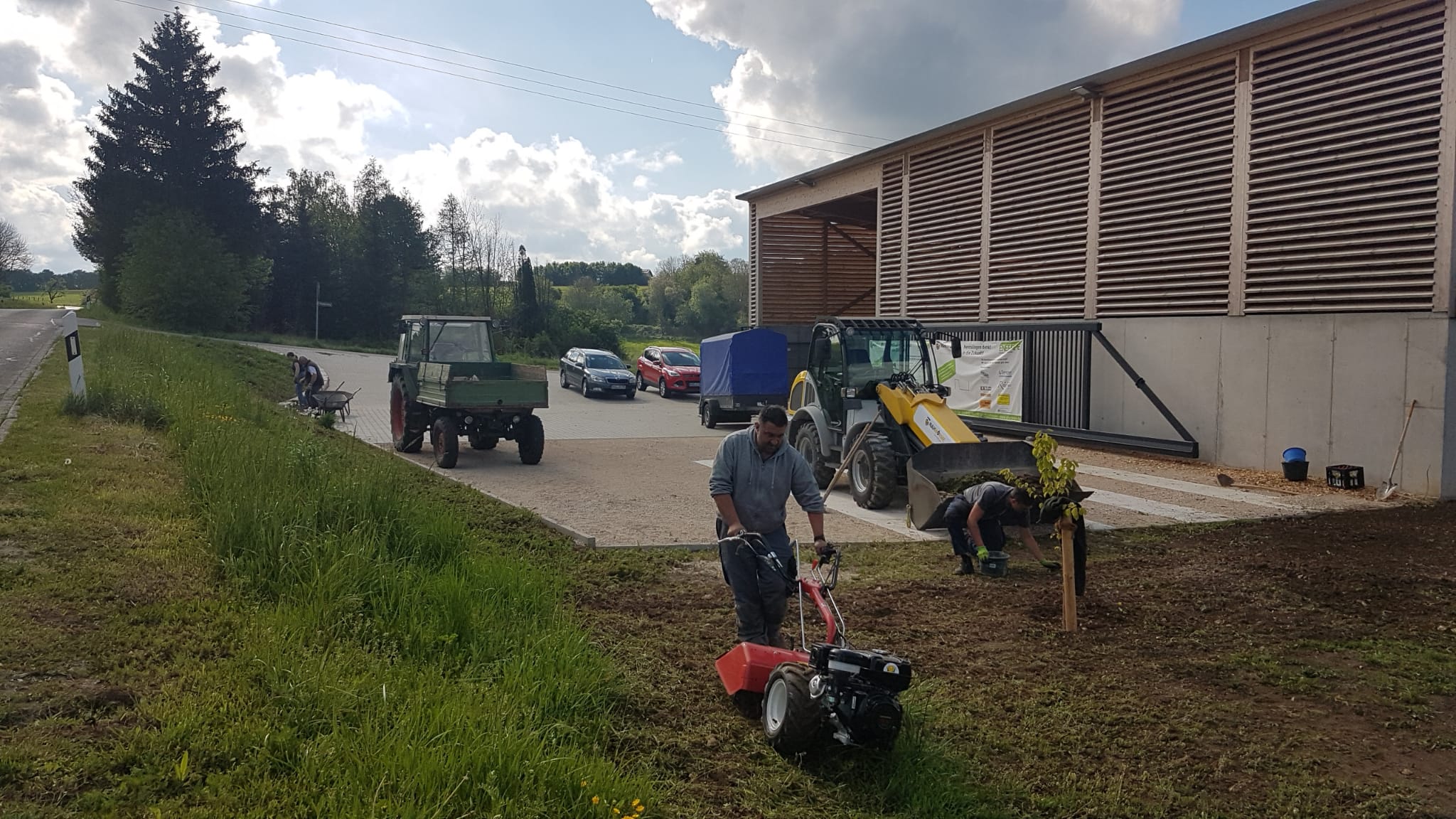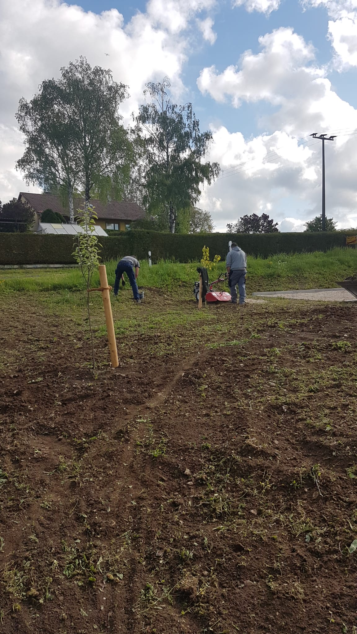 Neben der Pflanzung verschiedener Bäume wurde auch das Abklauben von Steinen, das Lockern des Bodens mittels einer Gartenfräse und die Ansaat einer Rasen- / Wiesenmischung erledigt. In einem zweiten Schritt sollen im Herbst noch mehrere Heckenabschnitte rund um das Grundstück angelegt werden.