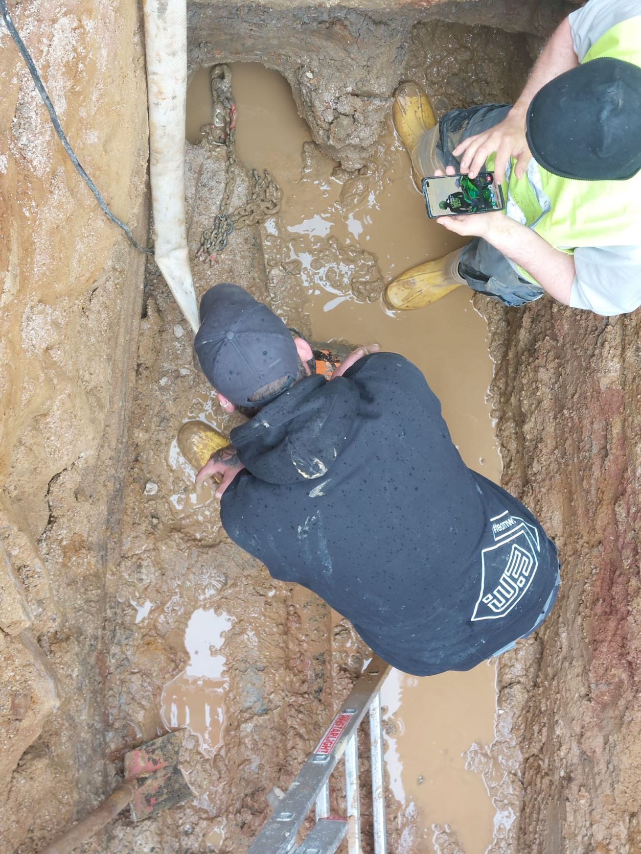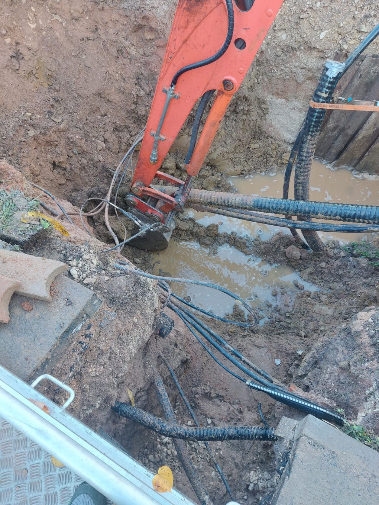 Für diese Spülbohrungen hat die Fa. Wagner sich professionelle Unterstützung der Fa. Bauer aus Runding geholt. Für eine Spülbohrung muss immer jeweils eine Startgrube und eine Endgrube ausgehoben werden, bevor dann der eigentliche Bohrprozess starten kann.