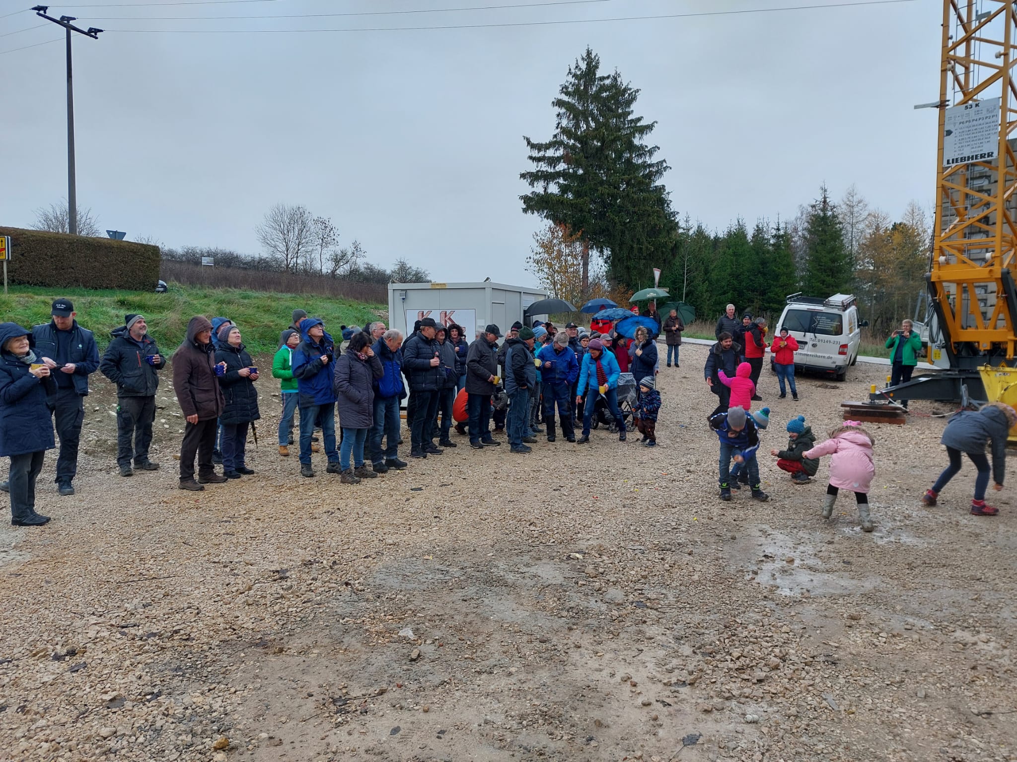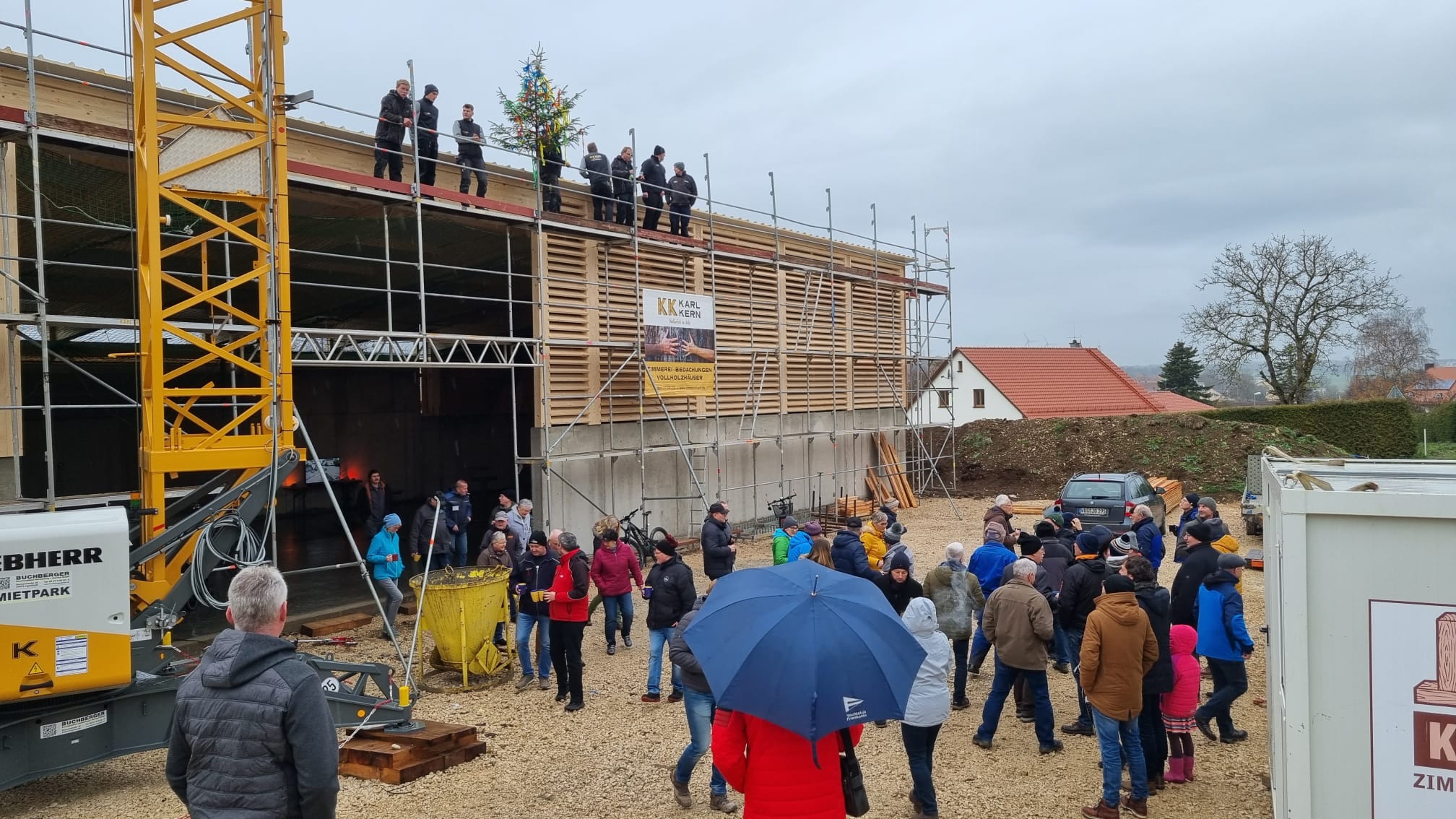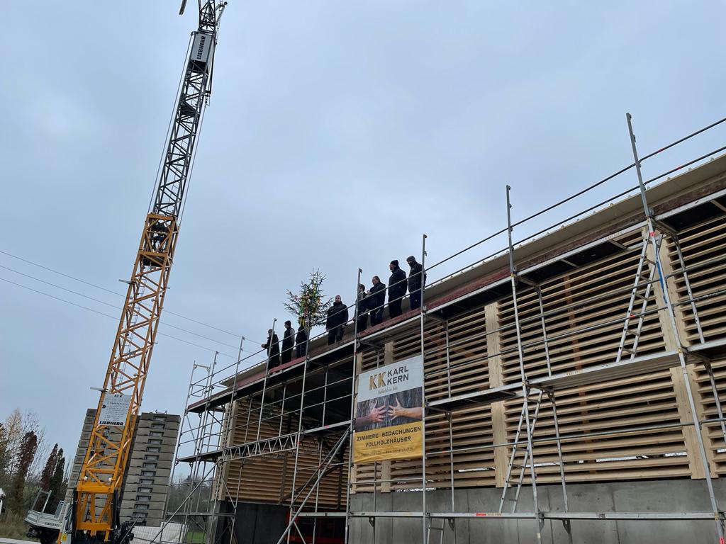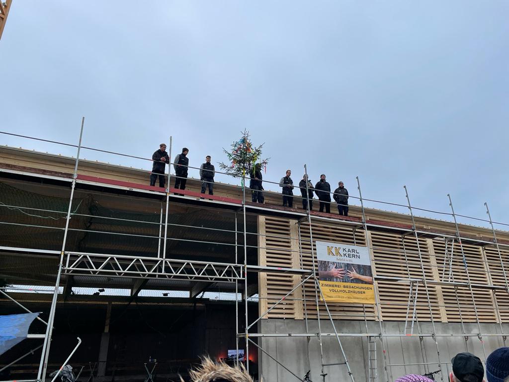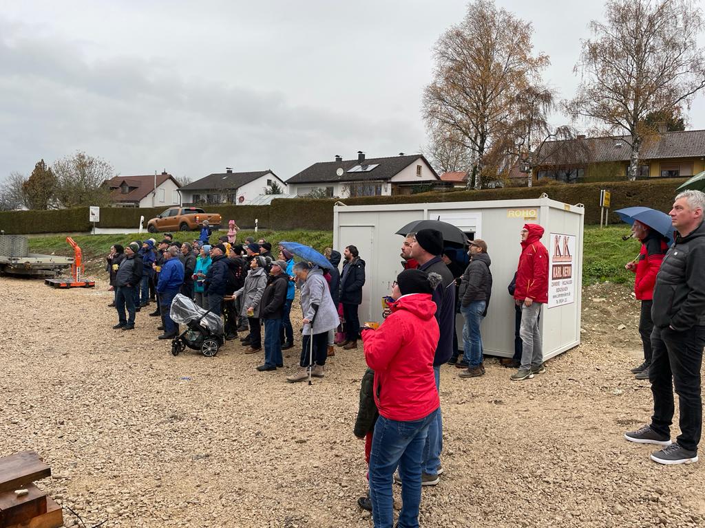 Am Freitag stand einer der größten Meilensteine bei der Umsetzung unseres Nahwärmenetzes an. Bei für die Jahreszeit typischem nass kaltem Wetter, haben sich ca. 100 Gäste und Handwerker am Heizhaus für das Richtfest eingefunden. Vor allem die warmen Getränke wie Glühwein und Kinderpunsch waren bei allen sehr beliebt, wodurch sich die Wartezeit bis zum Höhepunkt der Veranstaltung gut überbrücken ließ. Diesen bildete der Richtspruch, der durch die Fa. Kern vorgetragen wurde. Ganz traditionell wurden dabei drei Gläser Wein geleert, von denen zwei im Anschluss vom Dach herab geworfen wurden und eines beim Zimmerermeister verblieb.