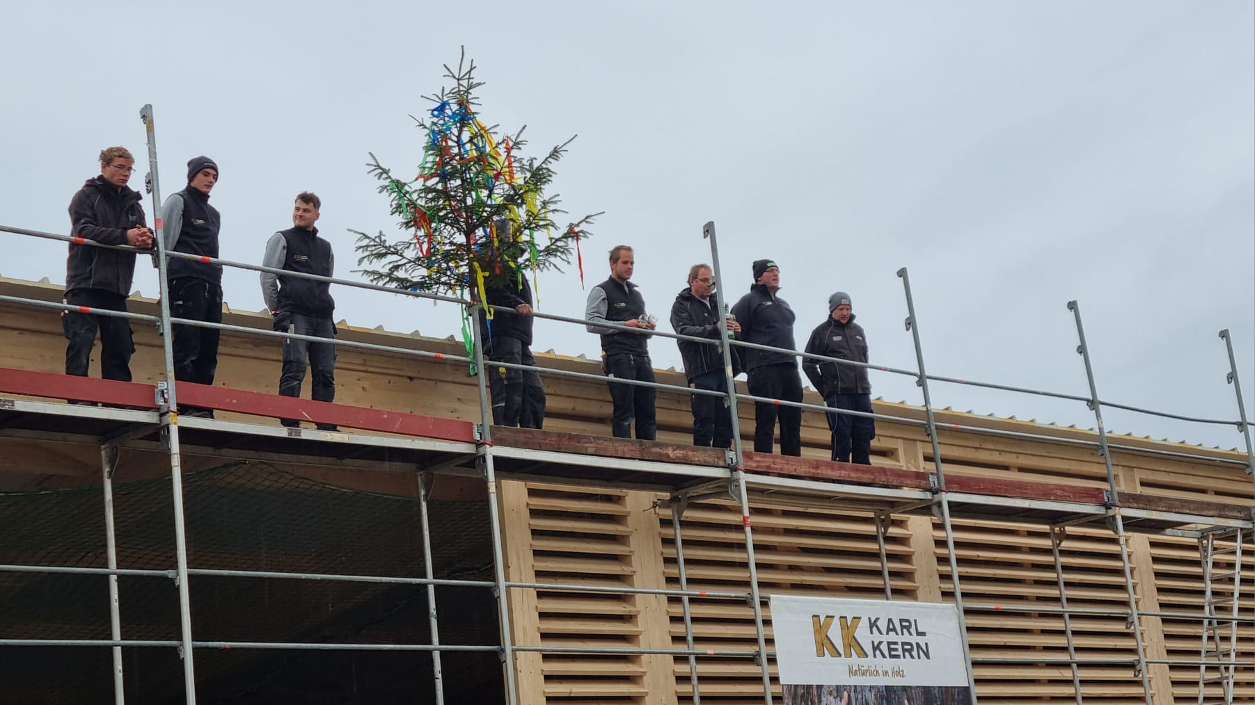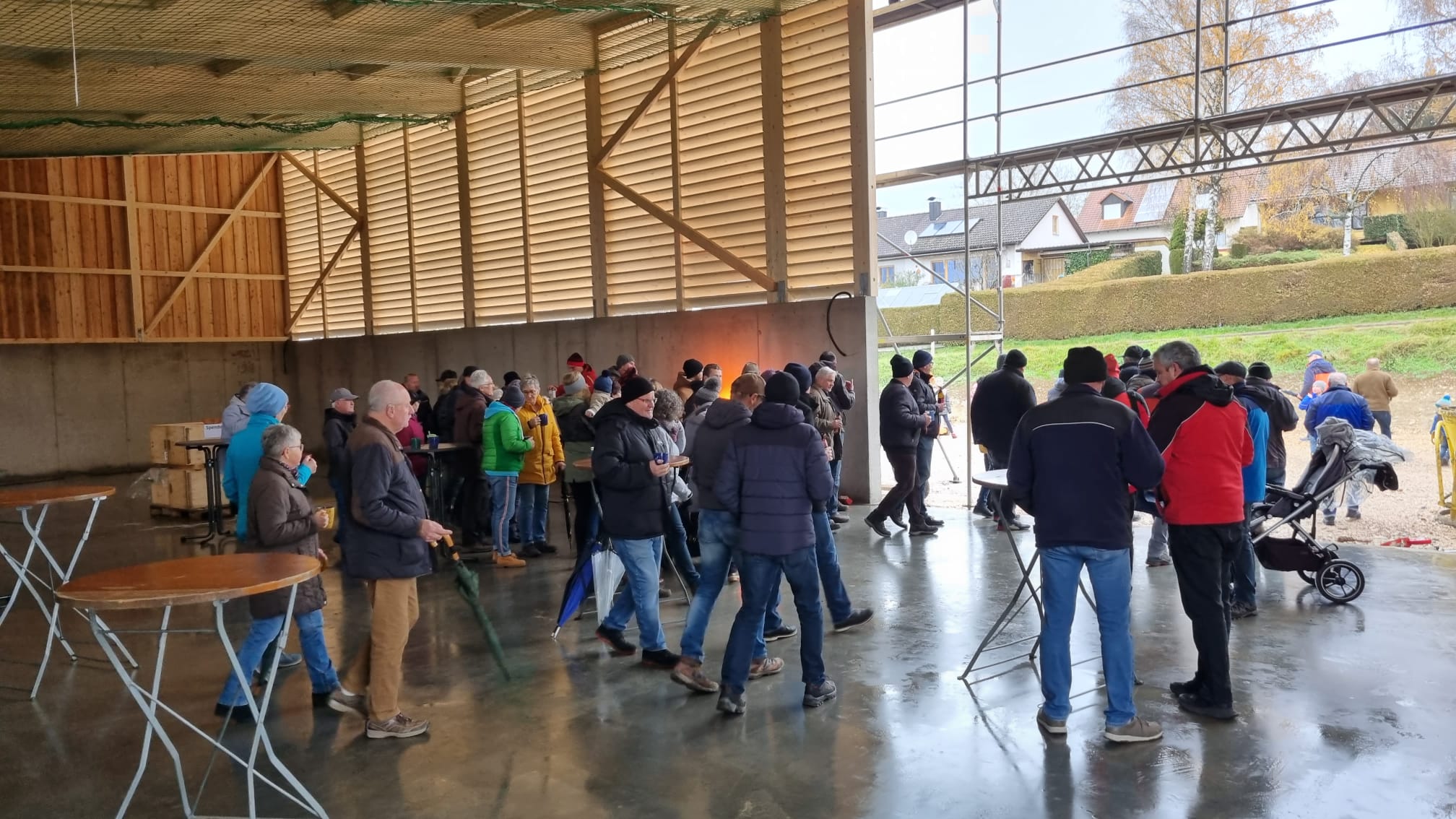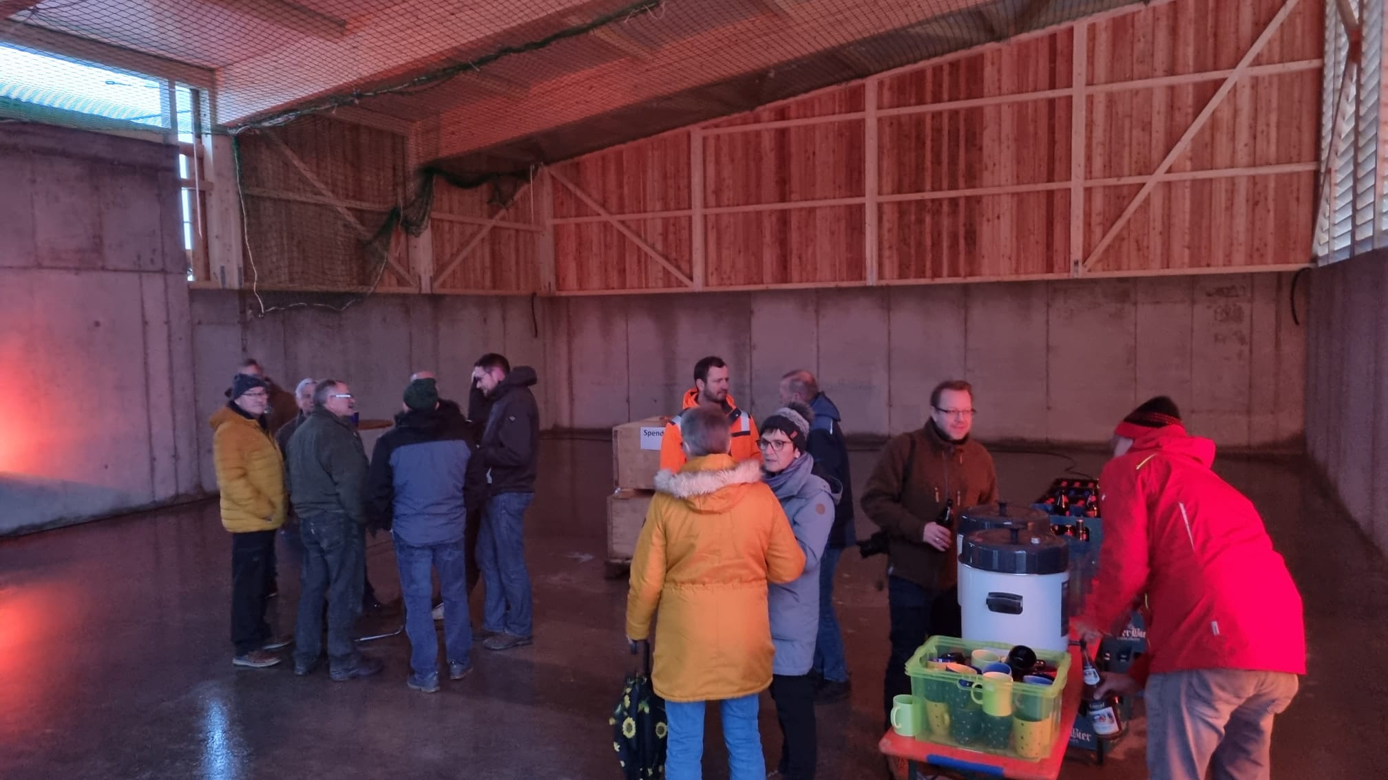 Am Freitag stand einer der größten Meilensteine bei der Umsetzung unseres Nahwärmenetzes an. Bei für die Jahreszeit typischem nass kaltem Wetter, haben sich ca. 100 Gäste und Handwerker am Heizhaus für das Richtfest eingefunden. Vor allem die warmen Getränke wie Glühwein und Kinderpunsch waren bei allen sehr beliebt, wodurch sich die Wartezeit bis zum Höhepunkt der Veranstaltung gut überbrücken ließ. Diesen bildete der Richtspruch, der durch die Fa. Kern vorgetragen wurde. Ganz traditionell wurden dabei drei Gläser Wein geleert, von denen zwei im Anschluss vom Dach herab geworfen wurden und eines beim Zimmerermeister verblieb.