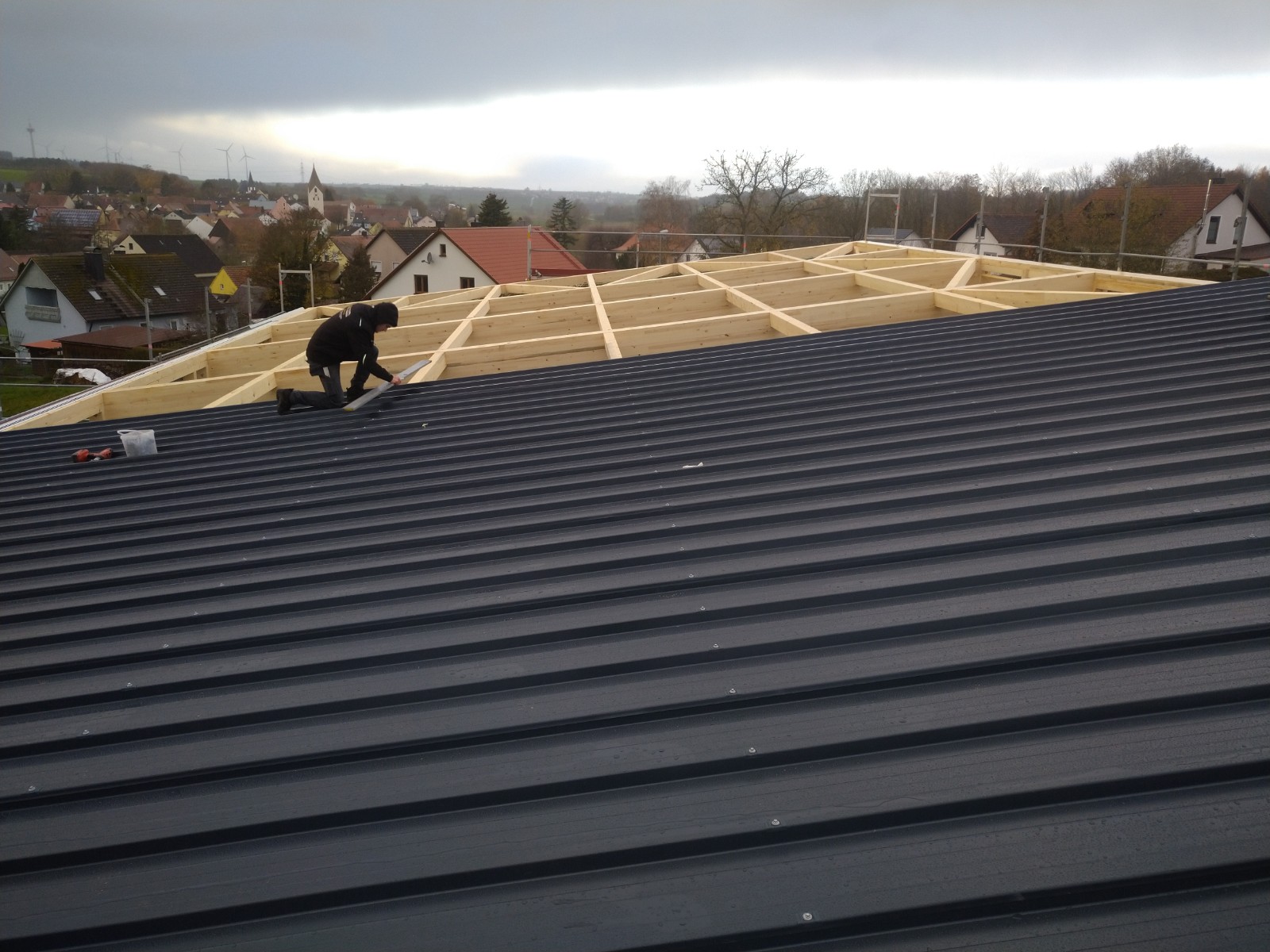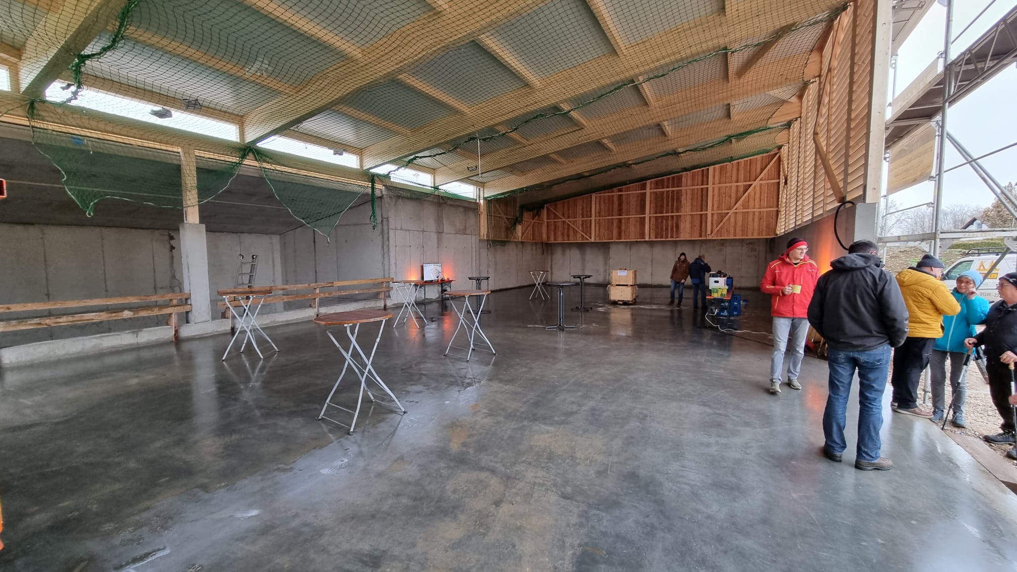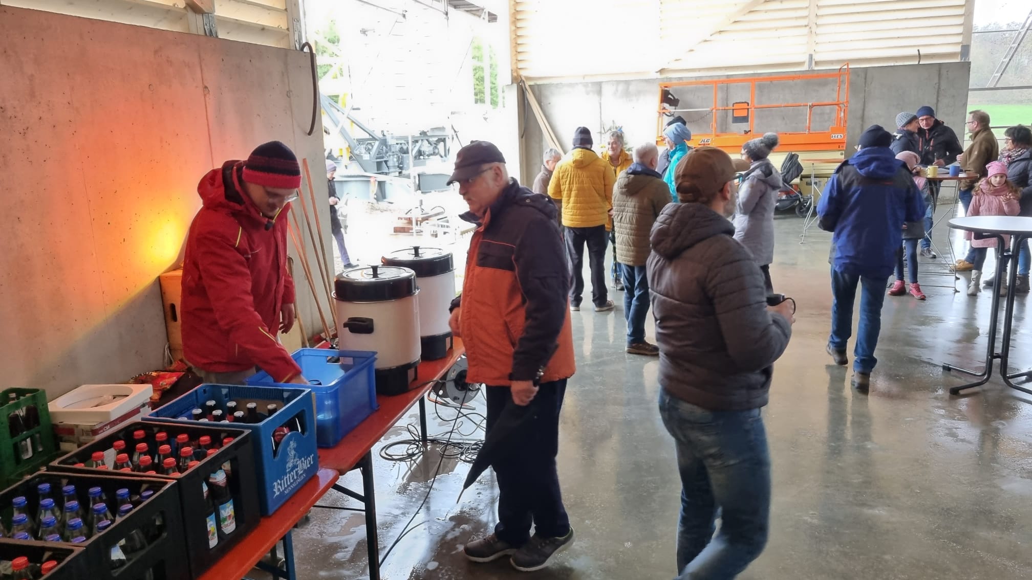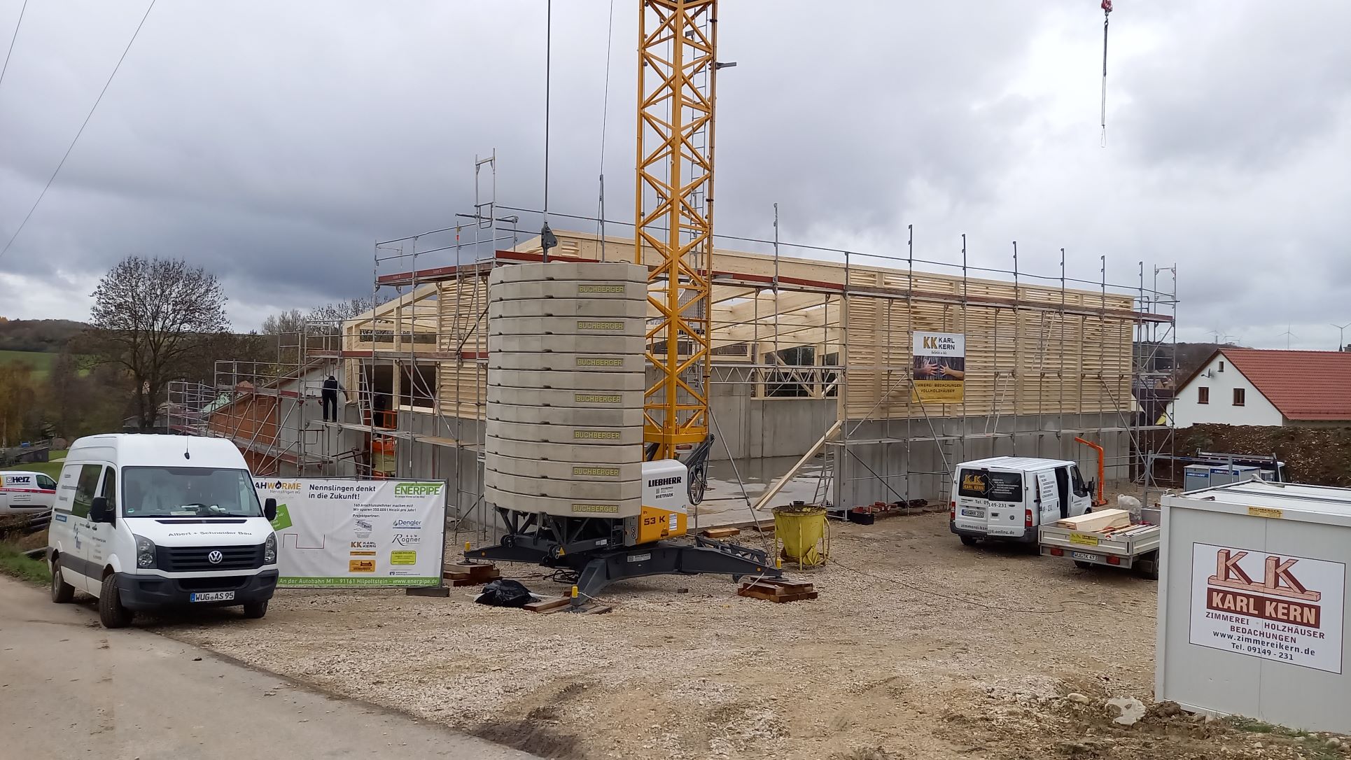 Am Freitag stand einer der größten Meilensteine bei der Umsetzung unseres Nahwärmenetzes an. Bei für die Jahreszeit typischem nass kaltem Wetter, haben sich ca. 100 Gäste und Handwerker am Heizhaus für das Richtfest eingefunden. Vor allem die warmen Getränke wie Glühwein und Kinderpunsch waren bei allen sehr beliebt, wodurch sich die Wartezeit bis zum Höhepunkt der Veranstaltung gut überbrücken ließ. Diesen bildete der Richtspruch, der durch die Fa. Kern vorgetragen wurde. Ganz traditionell wurden dabei drei Gläser Wein geleert, von denen zwei im Anschluss vom Dach herab geworfen wurden und eines beim Zimmerermeister verblieb.